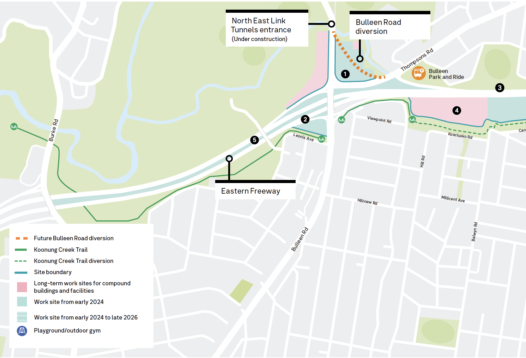 From March we’ll start to close sections of Koonung Creek Reserve between Bulleen Road and Doncaster Road in Balwyn North for two major work areas. These sites will support over 1000 workers and will be used to help build the new Bulleen Road interchange, new Eastern Freeway express and bus lanes, as well as new noise walls and pedestrian bridges.