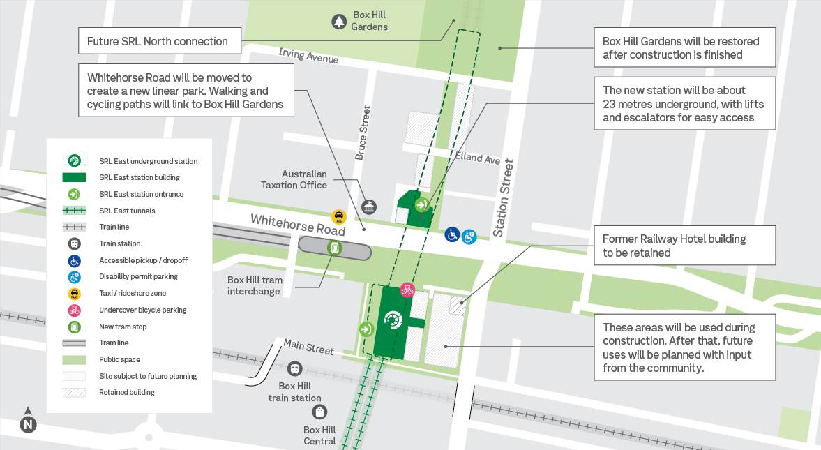 - A ground-level link from the SRL East station to the existing metro station at Box Hill Central