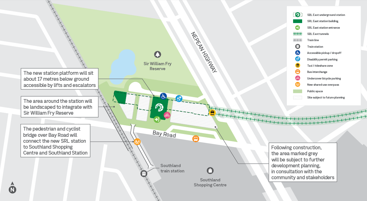 The new station platform will sit around 17m below ground, with a single station entrance facing Bay Road. New and improved public open space, walking and cycling paths and bridges, and signalised road crossings of Bay Road and Nepean Highway will make it easier and safer to move around the area.