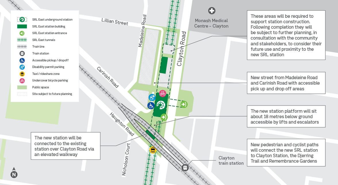The underground station at Clayton will be located north of Carinish Road and the existing Clayton Metro station. It will have 2 station entrances - 1 east of Clayton Road in the Remembrance Gardens and 1 west of Clayton Road near the existing station.