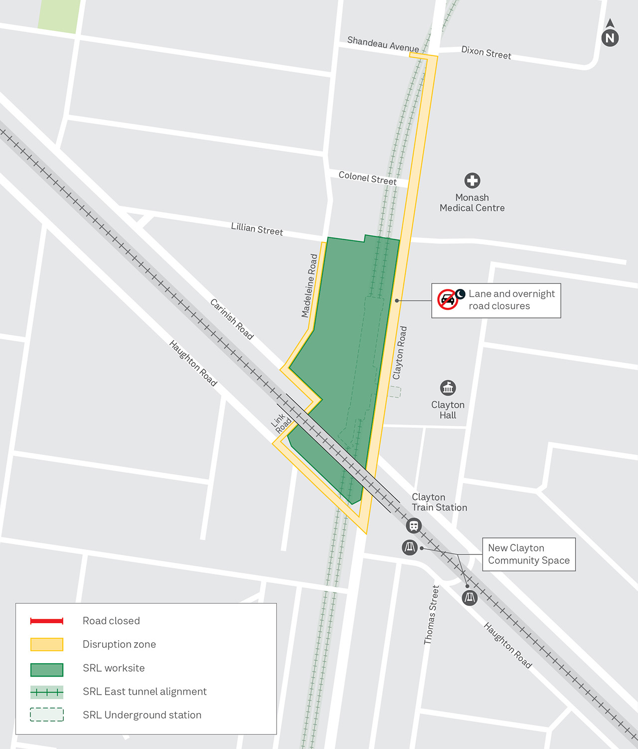 SRL worksite, west of Clayton Road | Day/night works/Extended: Ongoing | Preparing to excavate the station site |