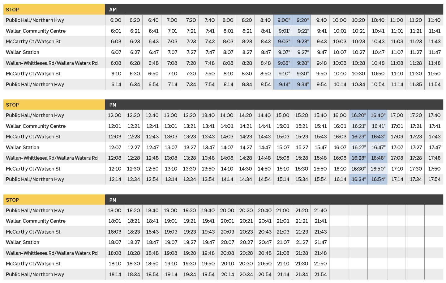| 6.08 am | 9.48 pm | Wallan-Whittlesea Rd/Wallara Waters Rd |