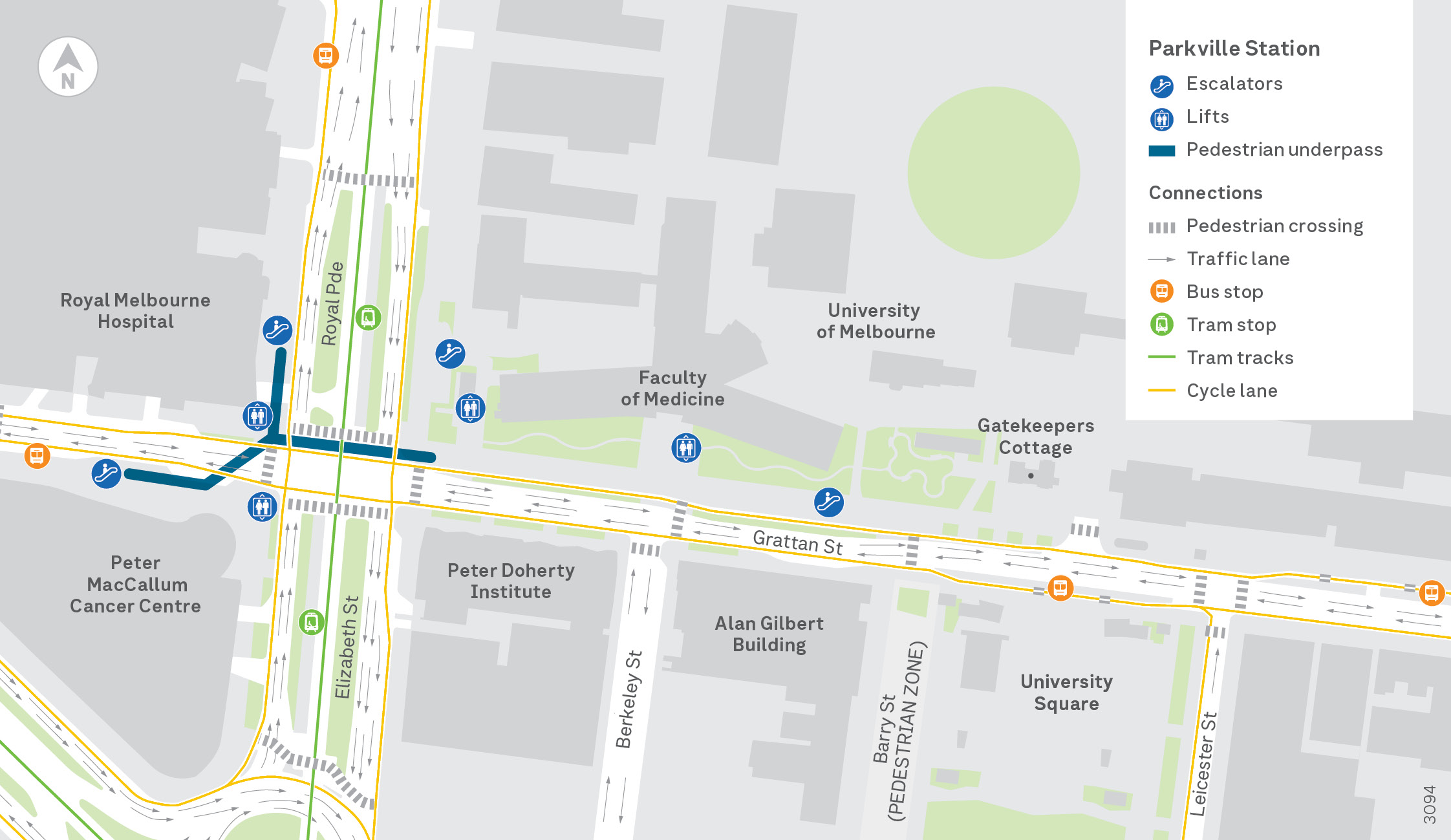 Parkville Station's main entrance on Grattan Street is a 5-minute walk to South Lawn, the Baillieu Library, the Medical Building, Melbourne Business School, and the Law Building. An entrance on the corner of Grattan Street and Royal Parade connects you with the west side of campus, including the Medical and Kenneth Myer buildings. Are you a med student doing a hospital rotation? Parkville Station has entrances outside the Royal Melbourne Hospital and Peter MacCallum Cancer Centre.