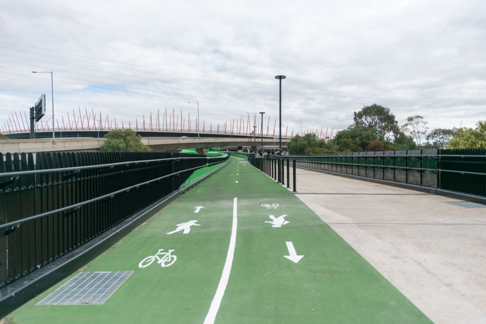 This new piece of infrastructure is a Victorian-first, suspended between the new elevated roadway along Footscray Road, with the bright-green 2.5km path running from Shepherd Bridge in Footscray to the city side of Moonee Ponds Creek, linking into the Federation Trail.